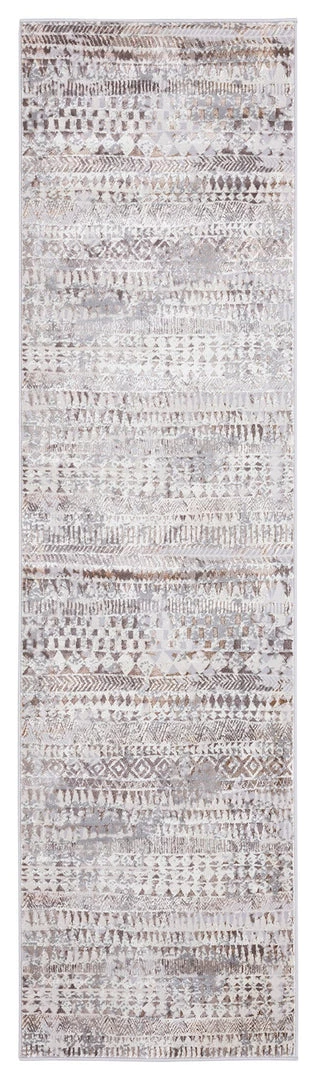 Selma is a beautiful grey runner rug with a distressed modern tribal print in ivory and brown.