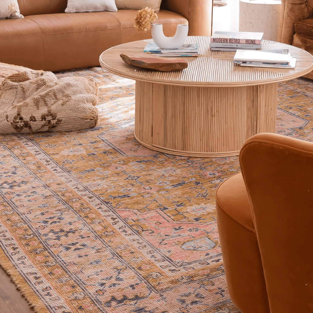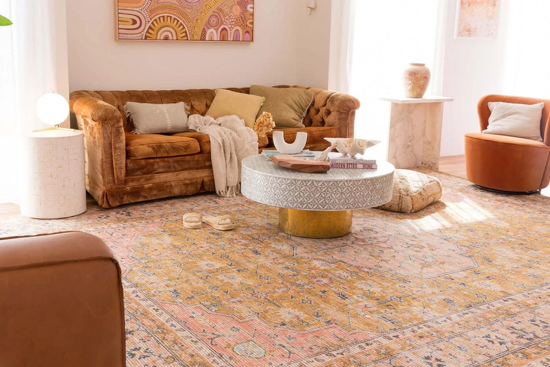 A stunning display of intricate floral patterns with lovely multi-tones of warm mustard, peach and blue. Evoking an old world charm and modern vintage feel which blends beautifully into your modern, tribal, boho or contemporary setting.