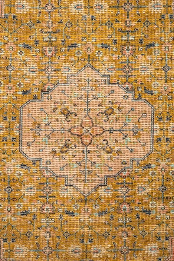 Sissa is a gorgeous mustard and peach rug with a floral medallion design.