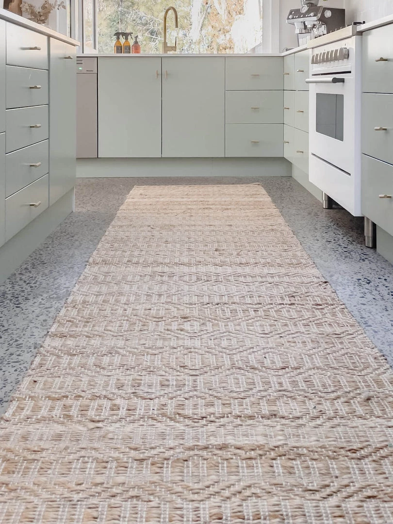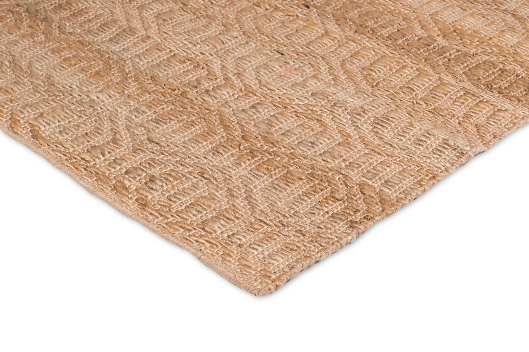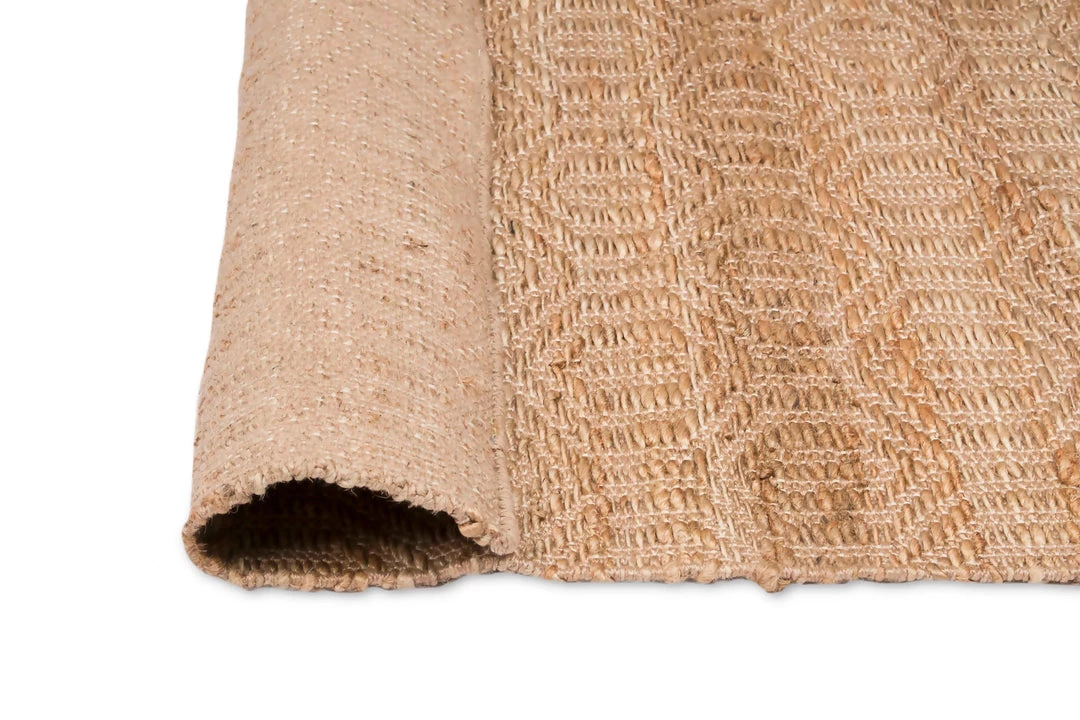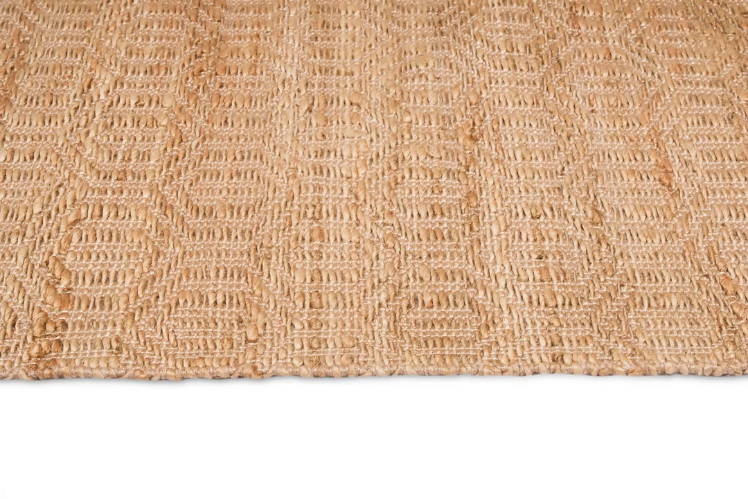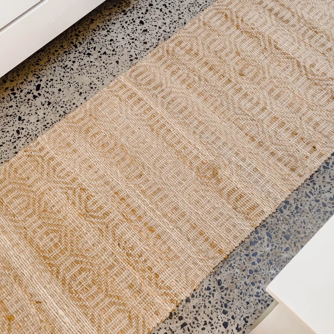 Stevie is a natural textured beauty, an undyed jute runner rug woven by hand into an intricate diamond tribal pattern.