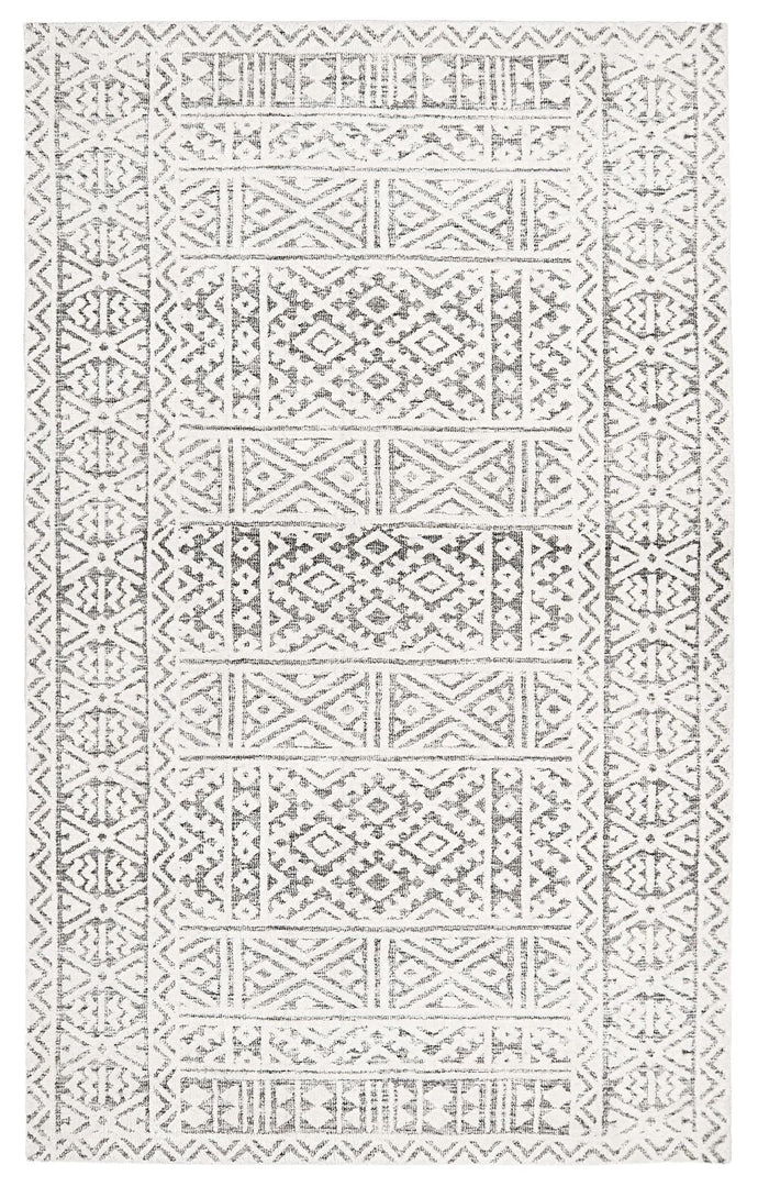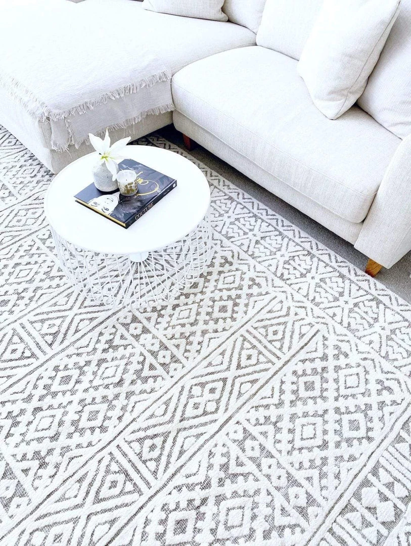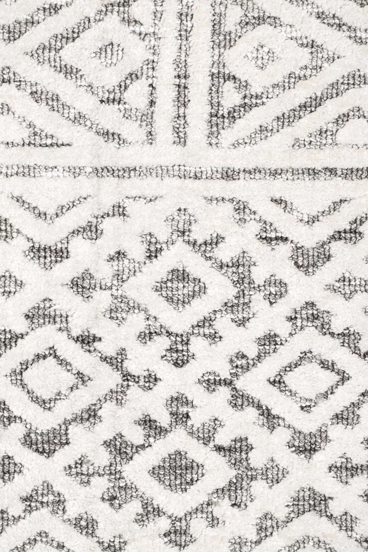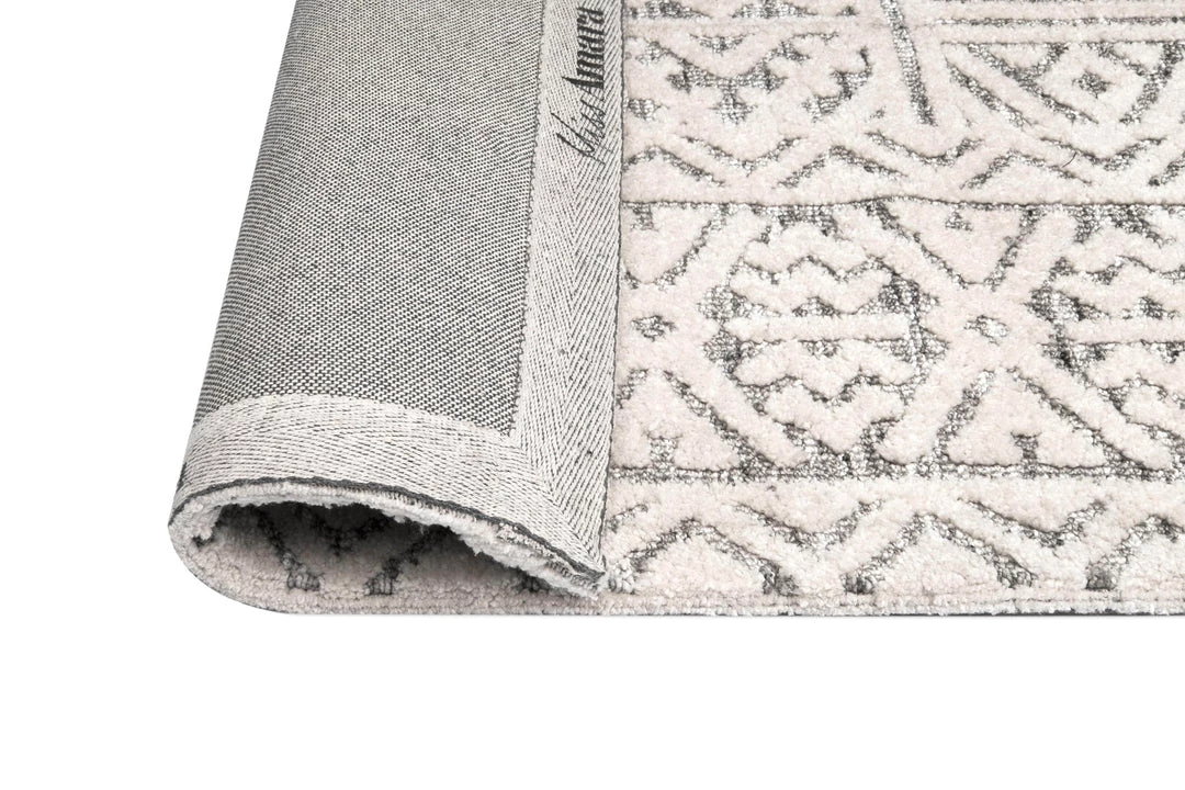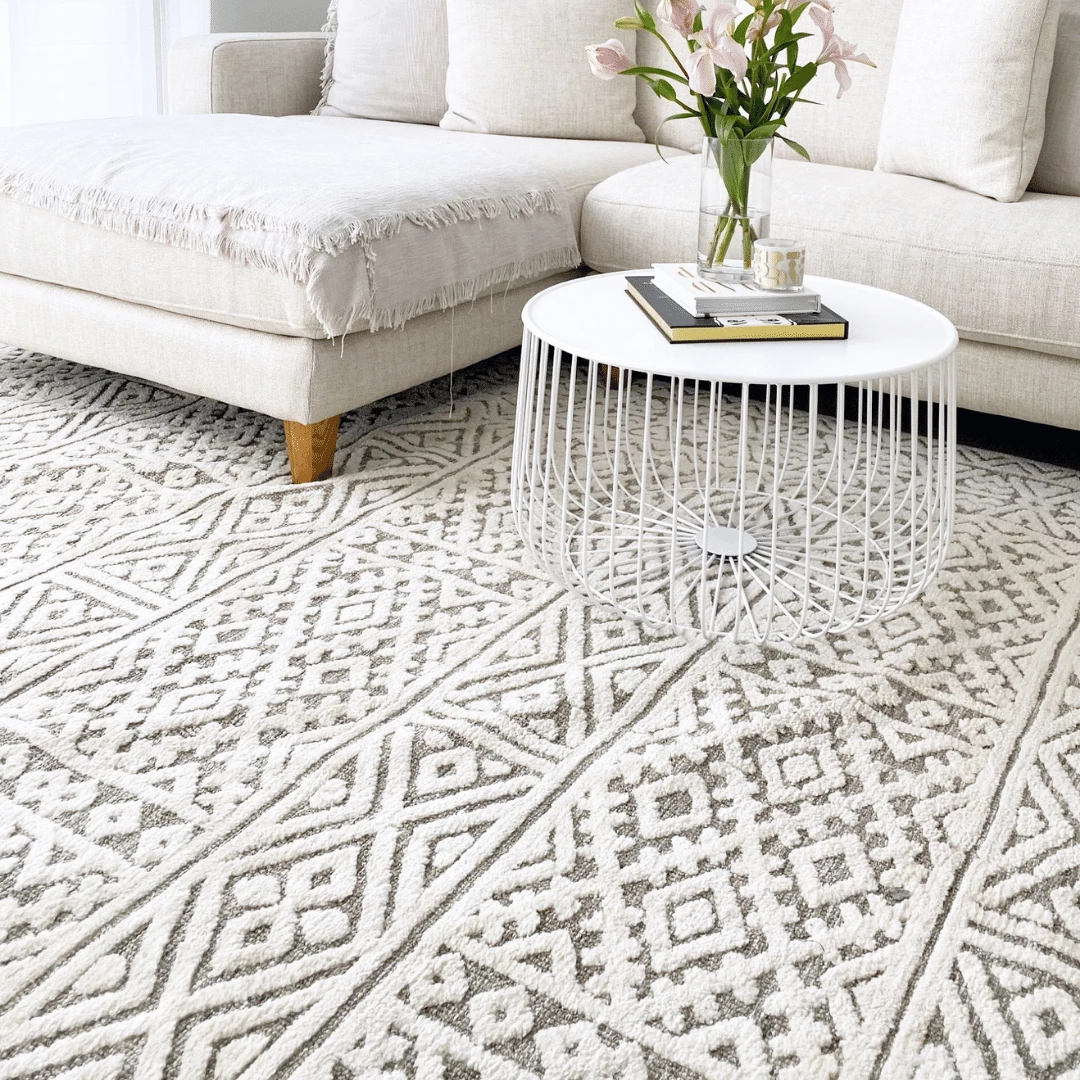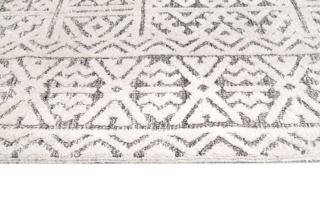Tatiana is a beautiful light ivory textured transitional rug with a geometric tribal pattern on a background of grey multi-tones.
