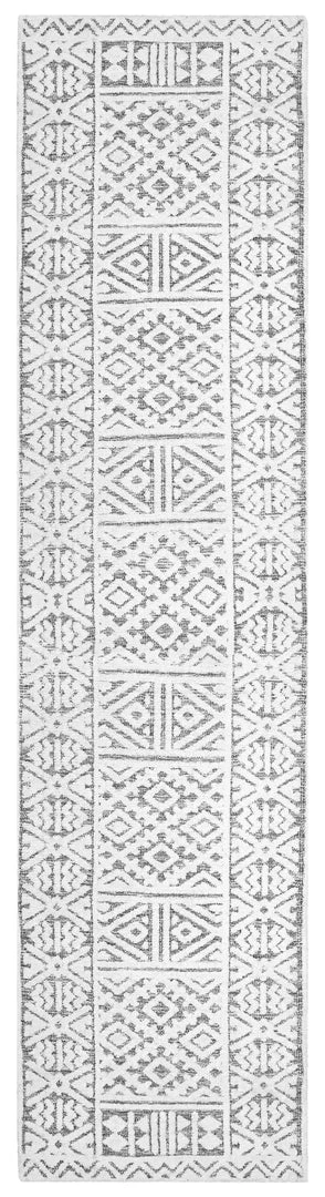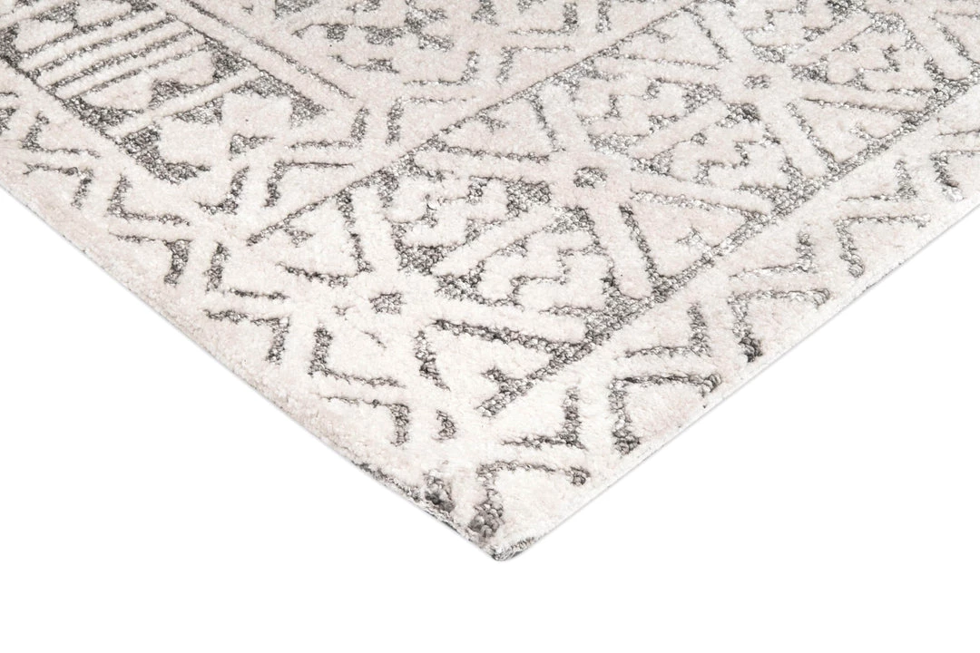 Tatiana is a beautiful light ivory textured transitional runner rug with a geometric tribal pattern on a background of grey multi-tones.