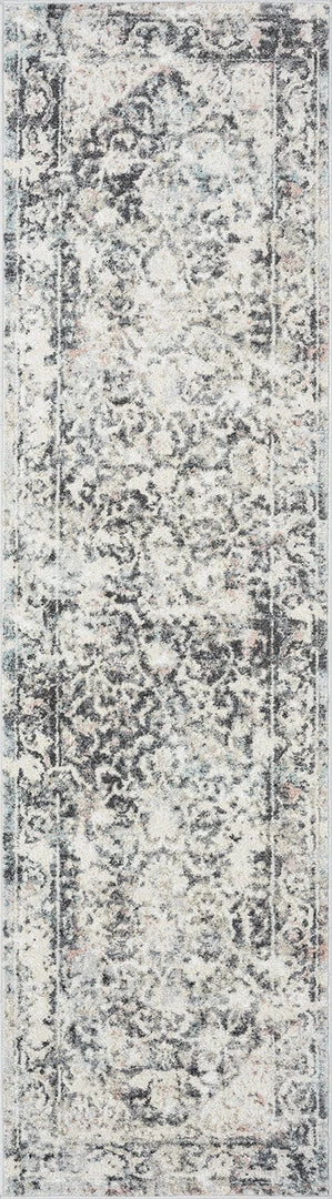 An exclusive design in the Miss Amara Collection, Thea is a bordered vintage distressed style. Decorated with elaborate floral motifs and ornate patterns in transitional multi-tones of ivory, grey, powder blue and pastel pink. A timeless and elegant addition to a modern, classic, bohemian or vintage space.