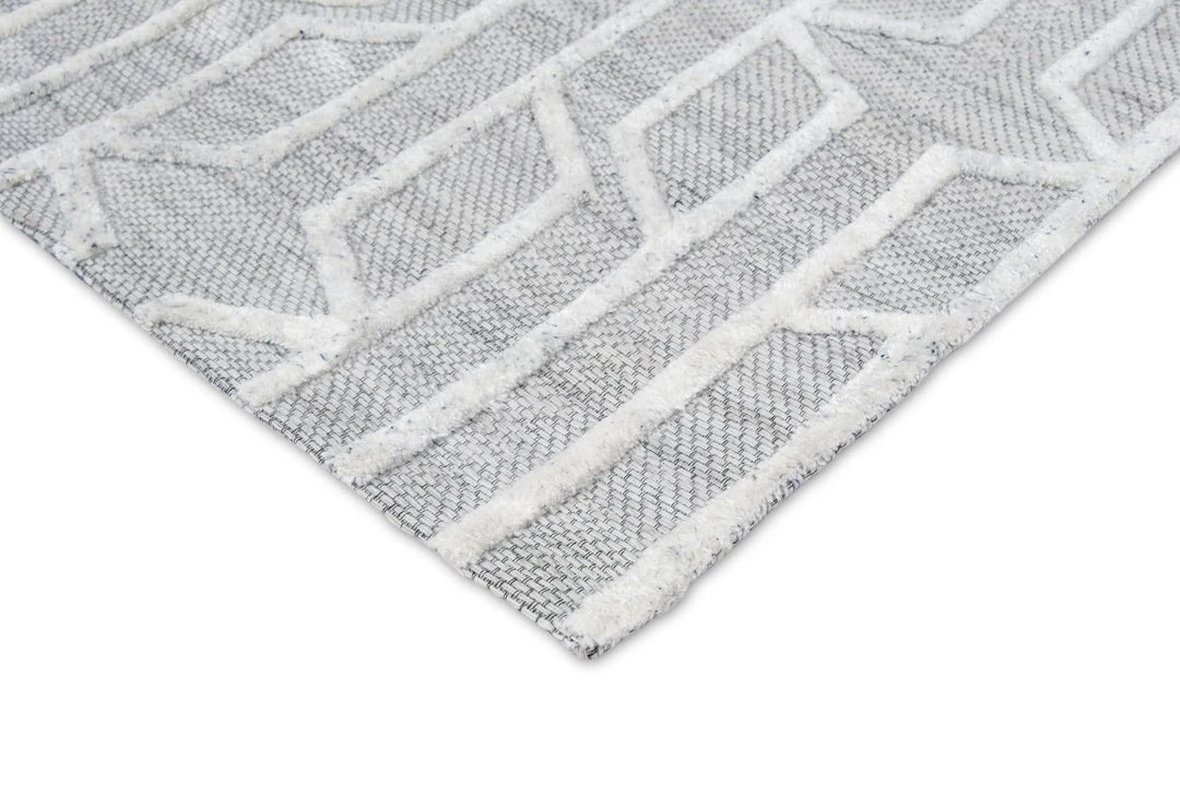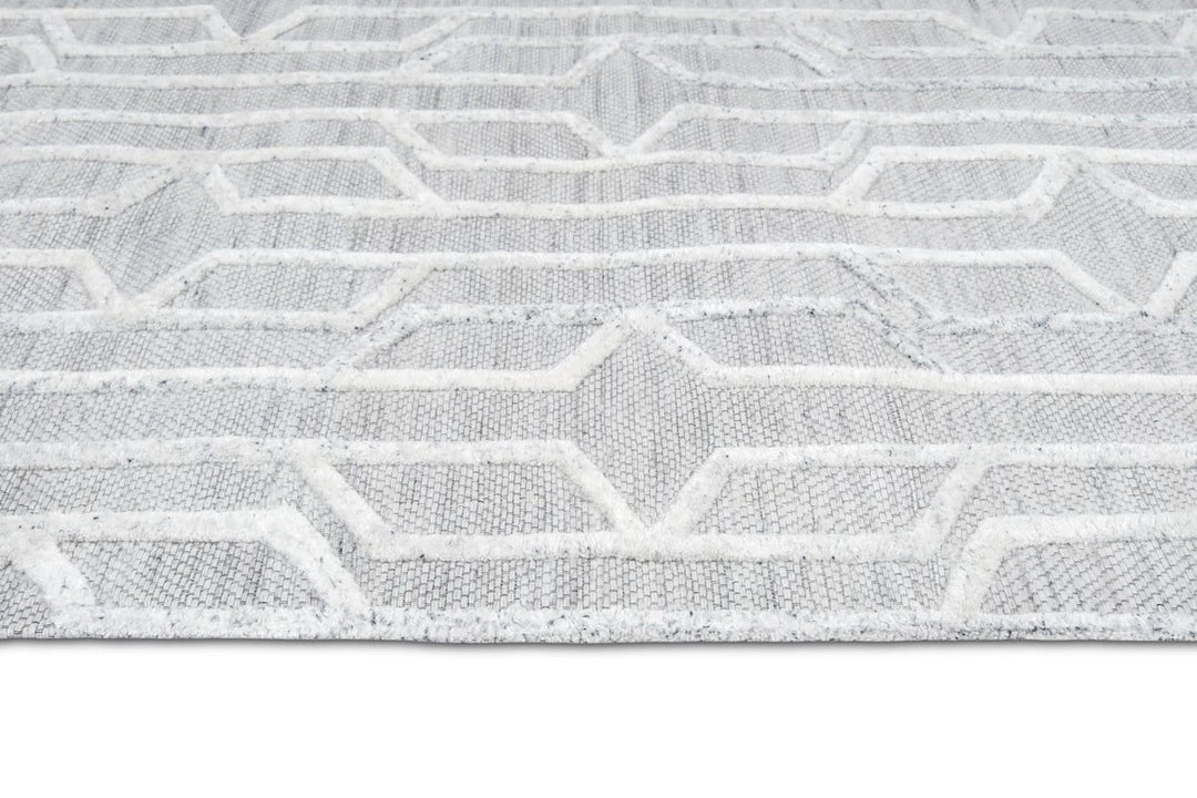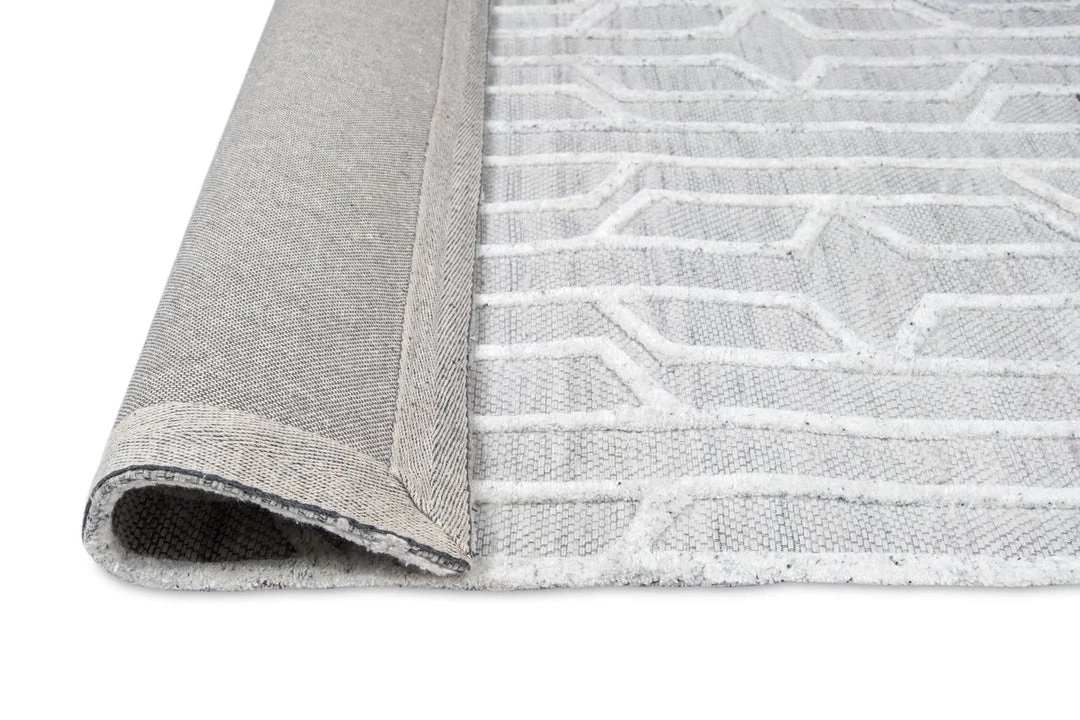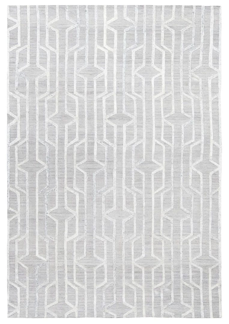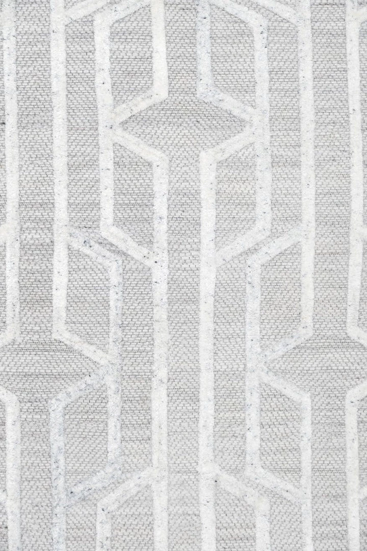 Verna is a stunning grey and ivory textured hand-loomed rug featuring a geometric pattern which is achieved by applying a jacquard technique.