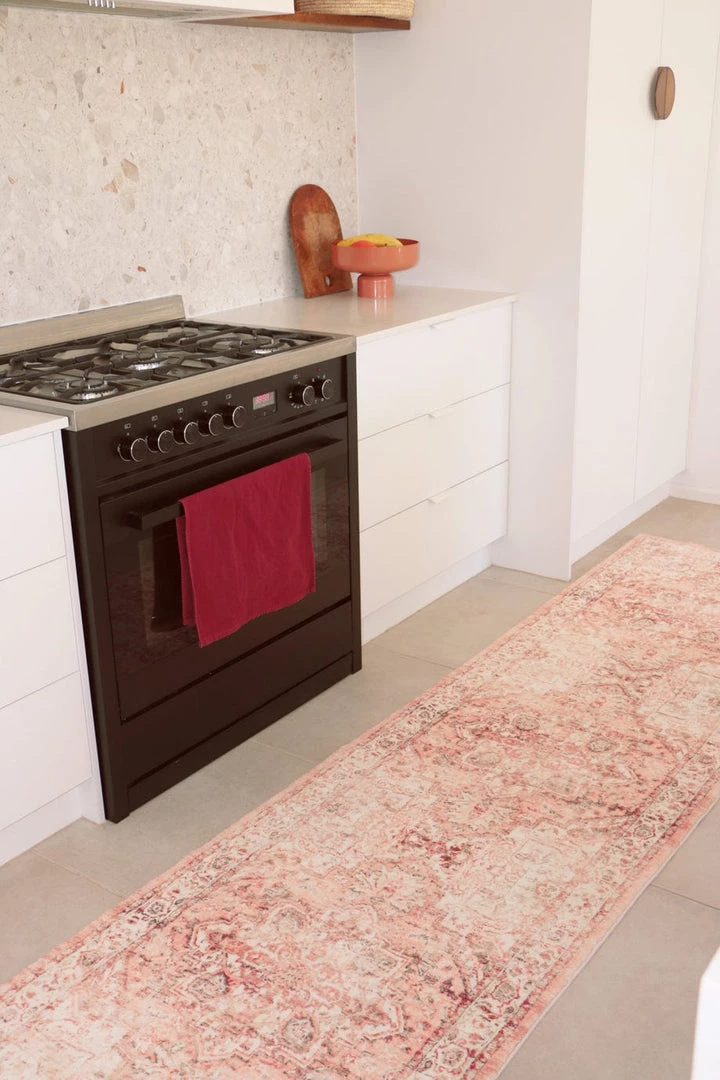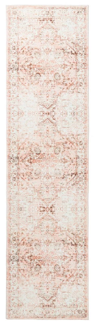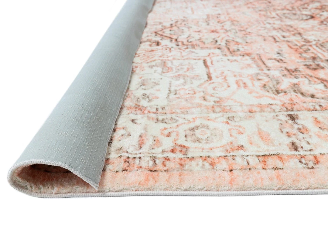 A stunning palette of peach and cream tones with subtle brown details. Veronique is a bordered vintage distressed style rug with elaborate motifs and ornate patterns. The beautiful design is printed on top of the fibres giving it a faded effect with a subtle vintage look. A timeless and elegant addition to a modern, classic, bohemian or vintage space.