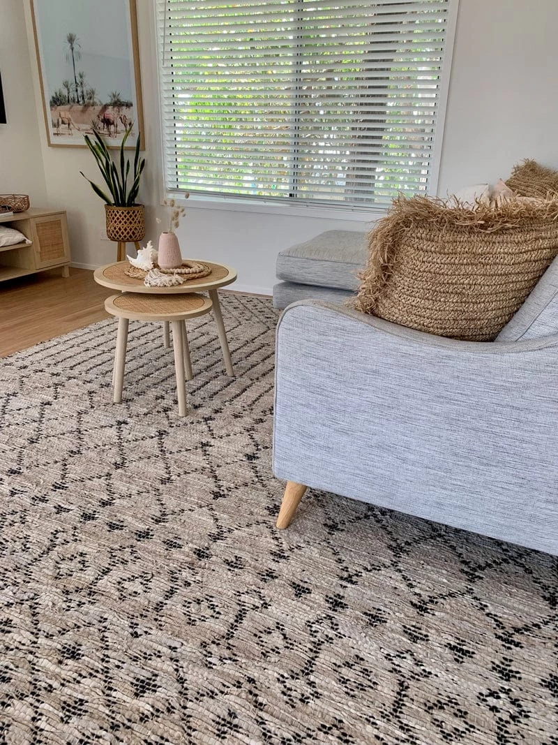 Viola is a stunning grey cream and black rug with a textured tribal diamond pattern.