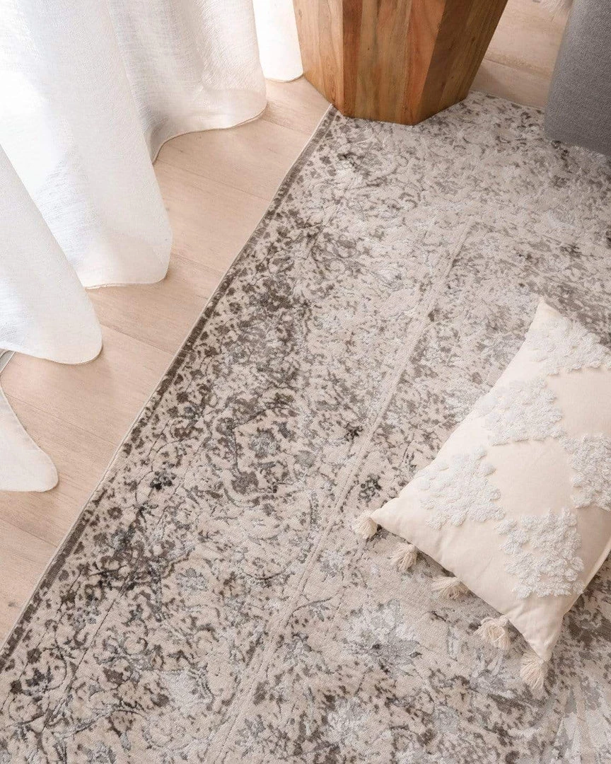 Winona is a classic blend of cream and ivory tones with a traditional style floral motif in silver and deep brown grey multi-tones.