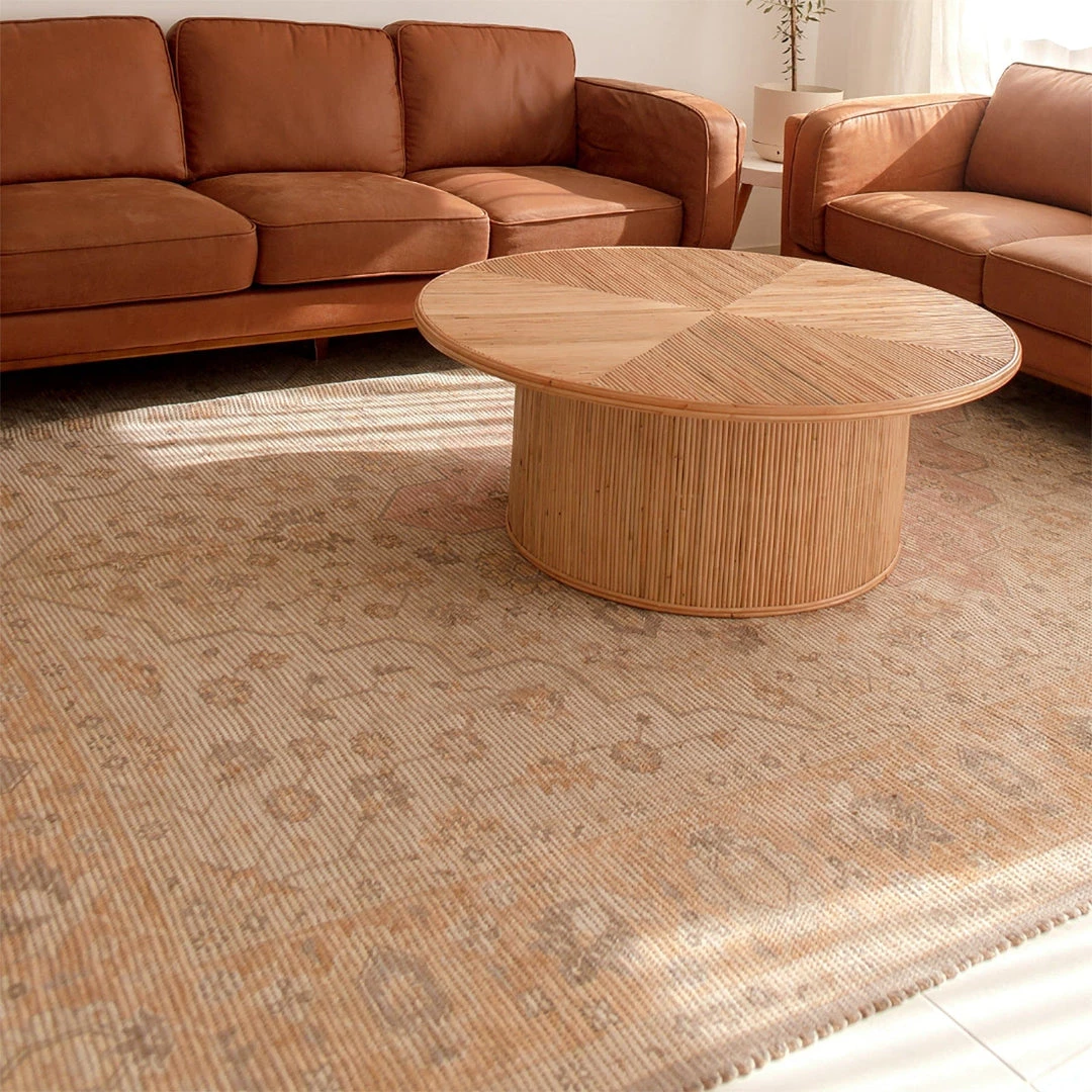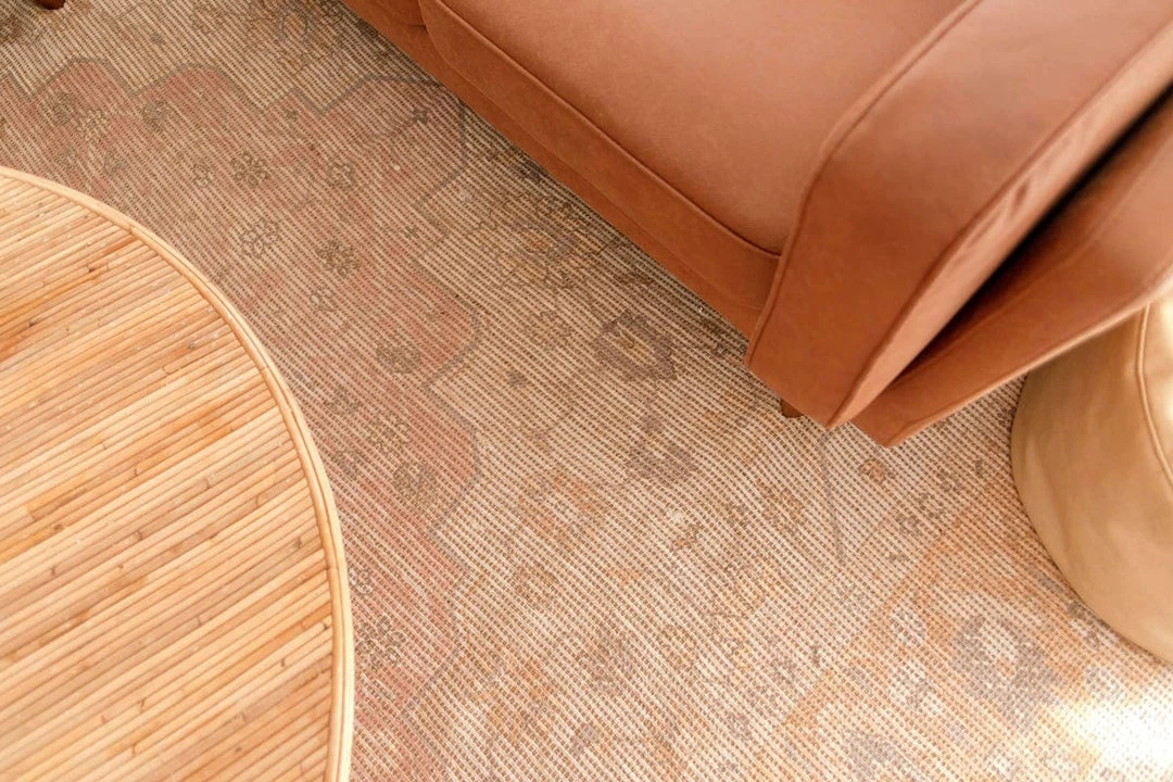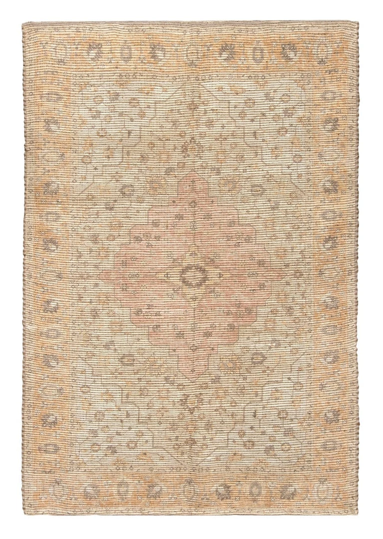 Yulia is a beautiful blush orange, pink and cream rug with a floral medallion design.