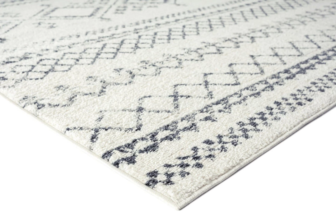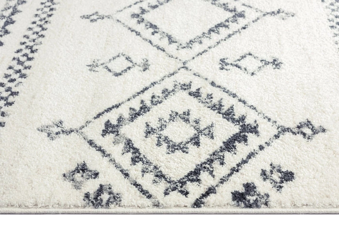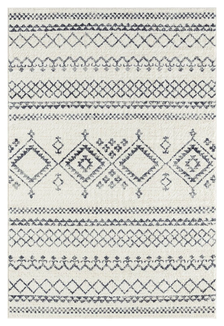 Zita is a gorgeous ivory and grey distressed transitional rug with a lined diamond tribal pattern.